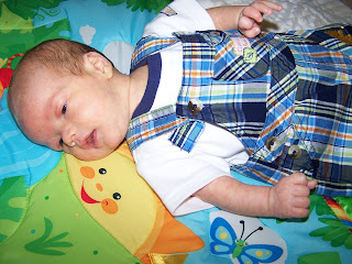July 31st was Drew's due date! I can't believe that he would have just gotten here! As ironic as it is, somehow we still ended up with him in the hospital, on his due date, Friday night. Now let me back up a little and explain what has been going on. Drew has been having some problems with acid reflux. He has been spitting up and acting like he is hurting while eating. The spitting up continued to worsen as he covered more than just the burp cloth but continued to cover himself, the boppy, the floor...We told this to his Doctor in one of our routine visits. He put him on Zantac for the acid reflux. It seemed to help Drew with the pain but the spitting up did not get any better. I was glad to see him not hurting and thought that maybe the spitting up was just a normal "baby thing".